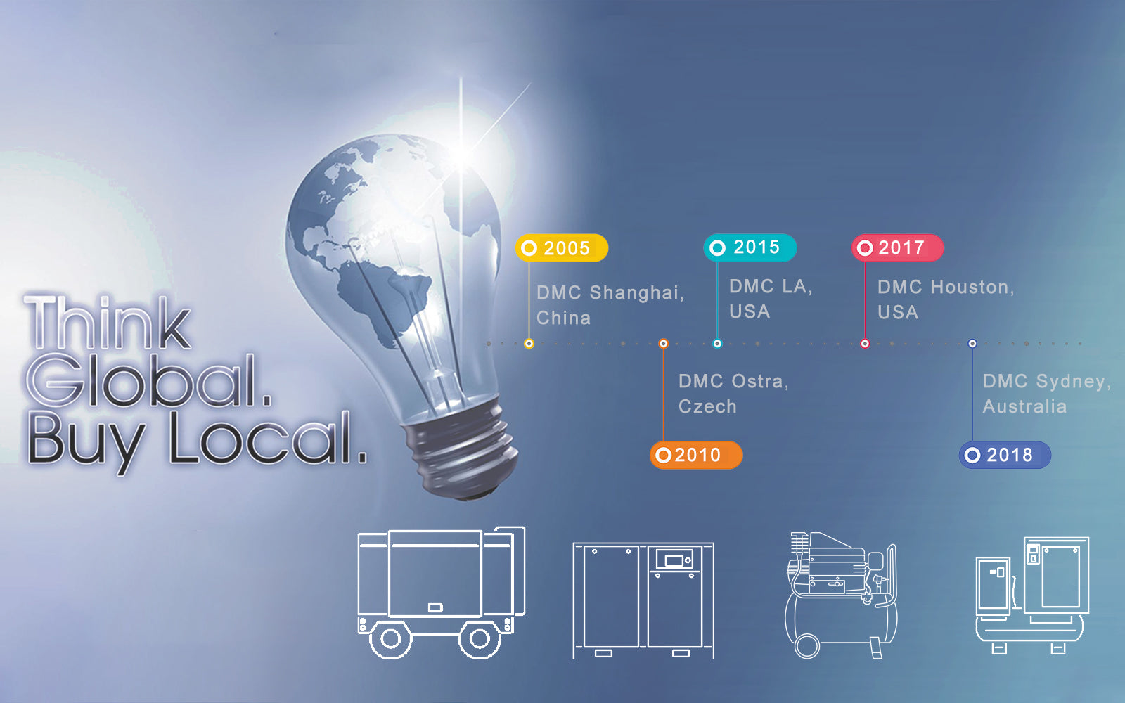 DMC is a professional manufacturer of air compressors, headquarter locate in Shanghai, China. Since established in 2005, we always focused on screw compression technology and high pressure breathing air system, parts of compressor we produced are pass through CE certificated for export. Until today, thousands of compressors have been available work for customers in more than 50 countries around the world and many of these machines are still operating reliably. Reliable quality has always been our goal. Innovation is the biggest driven power of our success, always promote us to offer customers a unique range of air compressors. We have develop a fully integrated machine for our customers in the United States that incorporates screw compressors, air dryers and receiver tank all-in-one to server mechanical shop job. We developed small compact screw compressor with diesel and petrol powered for our Australian customers. We developed new generation natural gas screw compressor for Mexican customers in the oil field. We develop low pressure screw compressors for customers in Bangladesh for the textile industry.